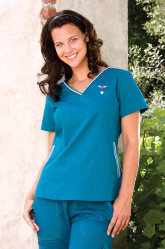 The KOI Ashley top is a sporty, crossover v-neck with playful embroideries and novelty strip trim. Features two side slash pockets. Center back length: 24 3/4''. 55%cotton, 45%polyester soft twill.You will not be disappointed with